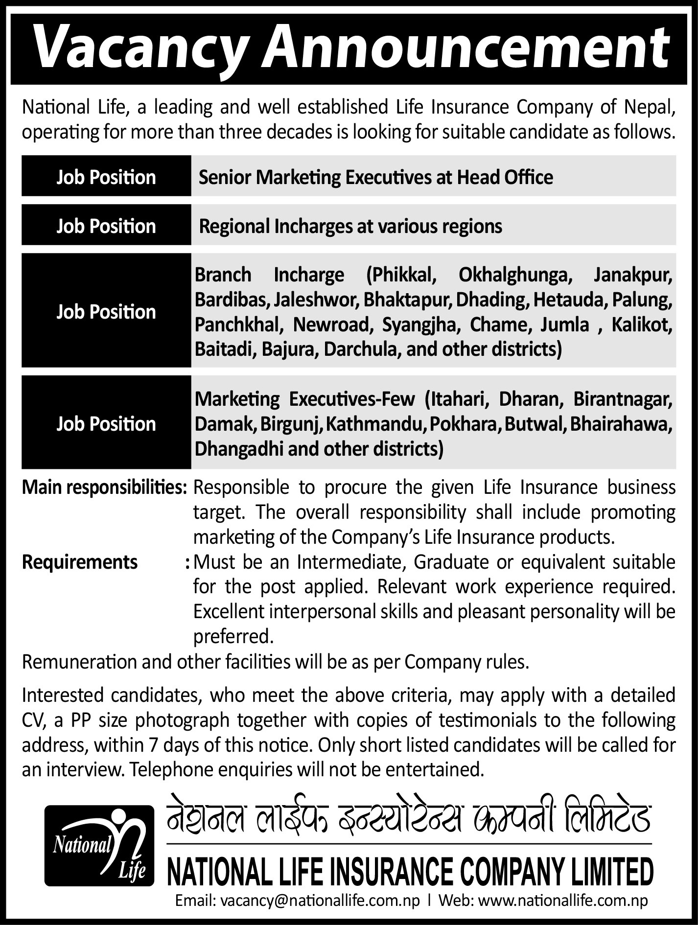 काठमाडौं । नेशनल लाईफ इन्स्योरेन्स कम्पनीले विभिन्न पदका लागि कर्मचारीको माग गरेको छ । कम्पनीले सिनियर मार्केटिङ एक्जुकेटिभका लागि केही, रिजनल इन्चार्चका लागि केही, ब्रान्च इन्चार्चका लागि केही र मार्केटिङ एक्जुकेटिभका लागि केही संख्यामा कर्मचारीको माग गरेको हो ।