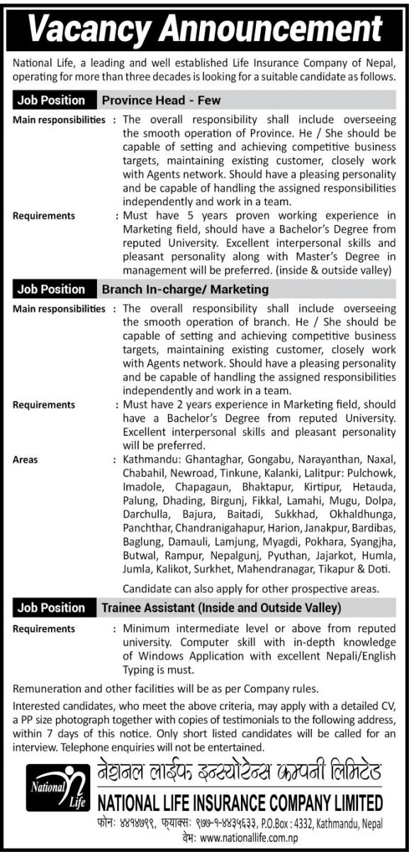 नेशनल लाईफ इन्स्योरेन्स कम्पनीको प्रदेश प्रमुख पदमा आवेदन दिनको लागि पाँच वर्षको कार्य अनुभव हुनु अनिवार्य छ भने शैक्षिक योग्यता स्नातक तह उत्तीर्ण हुनुपर्ने उल्लेख छ । त्यसैगरी, शाखा इन्चार्जको लागि समेत स्नातक तहको शैक्षिक योग्यताको साथै शाखा सञ्चालन गर्न सक्ने नेतृत्वदायी क्षमता भएको व्यक्तित्व हुनुपर्ने उल्लेख गरेको छ ।