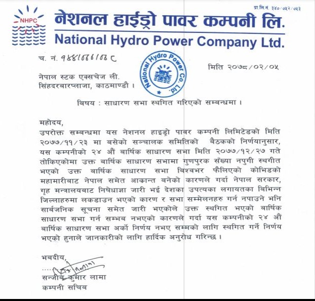हाल कोरोनाको बिषम परिस्थतीमा सभा सम्मेलनहरु गर्न नपाउने भने सार्वजनिक सूचना समेत जारी भएकोले उक्त स्थगित सभा अर्को सूचना प्रकाशन नभएसम्मको लागि स्थगित गरिएको कम्पनीले जनाएको छ ।