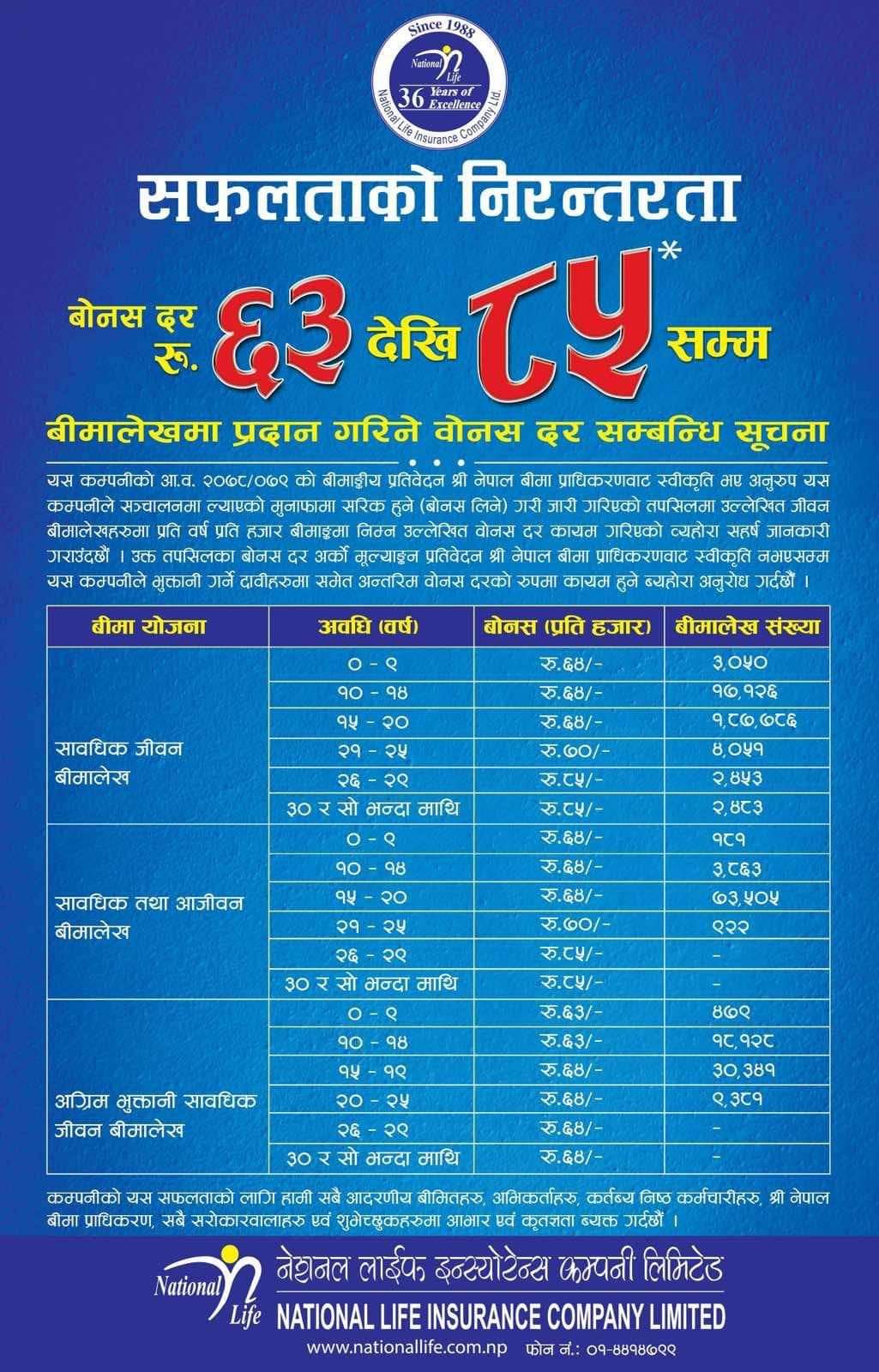 नेशनल लाइफले नेपाल बीमा प्राधिकरणको निर्देशन अनुरुप फ्युचर बोनस प्रोभिजनिङका बावजुद पनि सर्वाधिक आकर्षक बोनसदर दिन सफल भएको हो । यहि व्यवस्थाका कारण कतिपय बीमा कम्पनीको बोनसदरमा भारि गिरावट आइरहेको छ ।