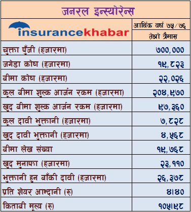 केही समय अघि मात्र संचालनमा आएको जनरल इन्स्योरेन्सले आफ्नो तेश्रो त्रैमासको वित्तिय विवरण सार्वजनिक गरेको छ। कम्पनीले आर्थिक वर्षको तेश्रो त्रैमाससम्म २० करोड ४९ लाख कुल बीमा शुल्क आर्जन गरेको छ भने ९ करोड ७३ लाख खुद बीमा शुल्क आर्जन गरेको छ। कम्पनीमा हाल १९ हजार ७ सय ६८ बीमा लेख संख्या कायम छन्। कम्पनीले तेश्रो त्रैमास सम्म २ करोड ३१ लाख खुद नाफा गरेको छ।