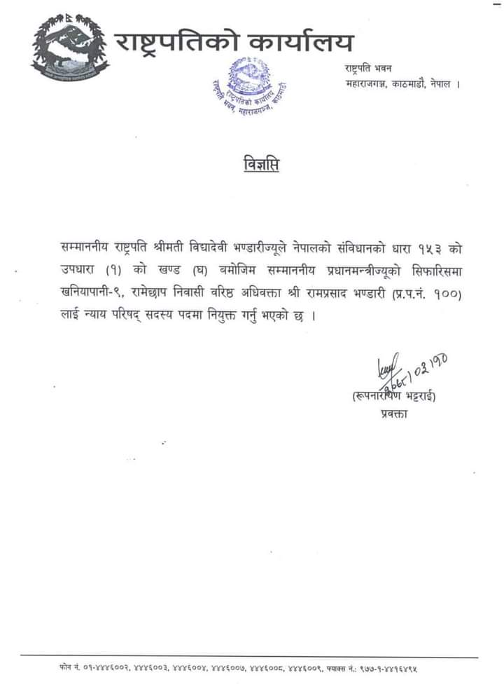 काठमाडौं । काठमाडौं । राष्ट्रपति विद्यादेवी भण्डारीले न्याय परिषद सदस्यमा रामेछापका रामप्रसाद भण्डारीलाई नियुक्त गरेकी छिन् । उनले नेपालको सविधानको धारा १५३ को उपधारा (१) खण्ड घ बमोजिम प्रधानमन्त्रीको सिफारिसमा वरिष्ठ अधिवक्ता भण्डारीलाई न्याय परिषद सदस्यमा नियुक्त गरेकी हुन् ।