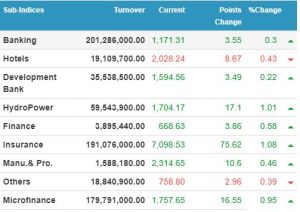 आज कारोबारमा आएका नौ समूहमध्ये होटल र अन्य बाहेकका सबै समूहमा वृद्धि देखिएको छ । जसमध्ये बीमा समूह ७५ दशमलव ६२ अंकले बढेको छ । त्यस्तै जलविद्युत समूह १७ दशमलव १ अंकले, लघुवित्त समूह १६ दशमलव ५५ अंकले, उत्पादन तथा प्रशोधन समूह १० दशमलव ६ अंकले, विकास बैंक समूह ३ दशमलव ४९ अंकले र बैंकिङ समूह ३ दशमलव ५५ अंकले बढेका छन् ।