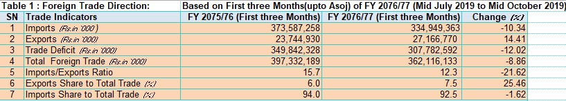 नेपालबाट हुने निर्यात १४ प्रतिशतले वृद्धि भई व्यापार घाटा साघुँरो पार्न योगदान पुर्याएको छ । गत बर्षको असोजमसान्तसम्ममा २३ अर्ब ७४ करोड ४९ लाख रुपैयाँको वस्तु नियात भएकोमा यस बर्ष भने २७ अर्ब १६ करोड ६७ लाख रुपैयाँको वस्तु नेपालबाट विभिन्न देशहरुमा गएको छ । चालु आर्थिक वर्षको सुरुका तीन महिनामा नेपालको व्यापार घाटा १२ प्रतिशतले घटेकोे छ ।