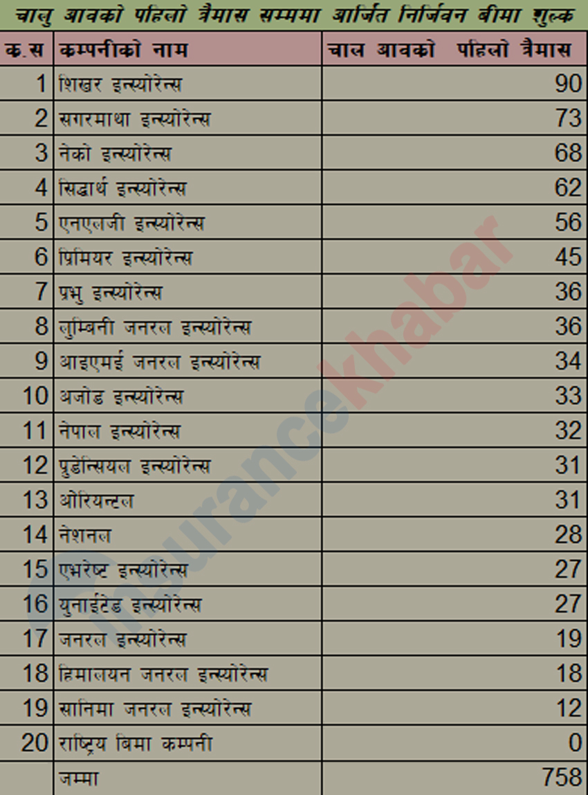 बीमा समितिको तथ्याङ्क अनुसार शिखर इन्स्योरेन्स कम्पनी पहिलो हुन सफल भएको छ । उसले तीन महिनामा ९० करोड रुपैयाँ कूल बीमा शुल्क आर्जन गरेको छ। त्यसैगरी, दोस्रोमा सगरमाथा इन्स्योरेन्स छ । सो कम्पनीले कूल ७३ करोड रुपैयाँ बीमा शुल्क आर्जन गर्न सफल भएको छ । त्यस्तै नेको इन्स्योरेन्स तेस्रो हुन सफल भएको छ ।सो कम्पनीले ६८ करोड बीमा शुल्क आर्जन गर्न सफल भएको छ।