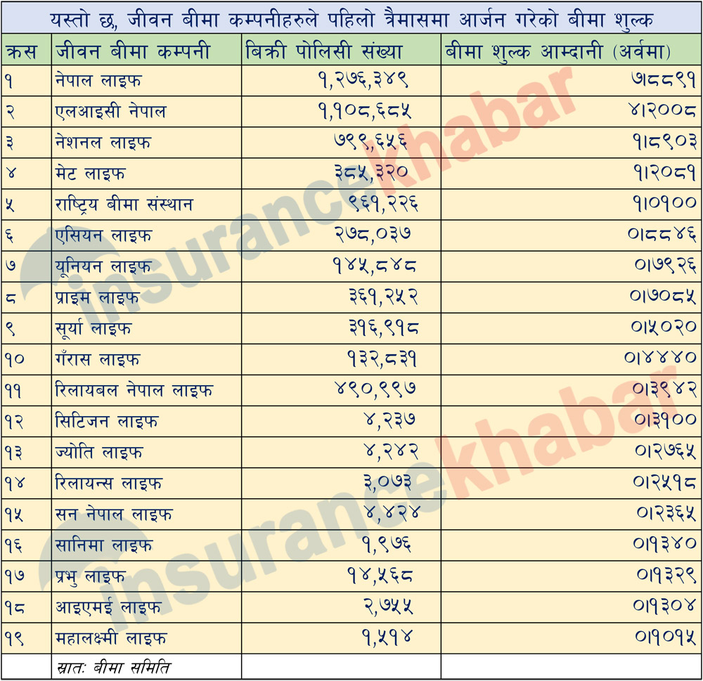 पहिलो त्रैमासमा नेपाल लाईफले सात अर्ब ८८ करोड ९१ लाख रुपैयाँको बीमा शुल्क आर्जन गर्न सफल भएको छ भने प्रतिस्पर्धामा देखिएको छ एलआईसी नेपाल । एलआईसी नेपालले चार अर्ब २० करोढ आठ लाख रुपैया कुल बीमा शुल्क आर्जन गर्दा तेस्रो नम्वरमा रहेको नेशनल लाईफले एक अर्ब ८९ करोड तीन लाख रुपैयाँ आर्जन गर्न सफल भएको छ ।