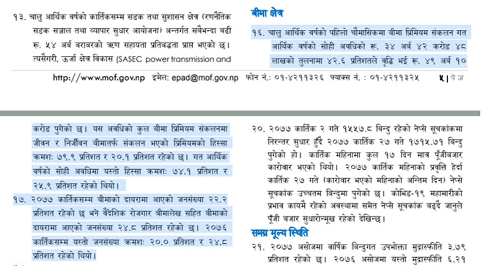 त्यस्तै, गत आर्थिक वर्षको पहिलो त्रैमासमा जीवन बीमा शुल्क र निर्जिवन बीमा शुल्कको हिस्सा क्रमशः ७९.९ र २०.१ प्रतिशत रहेकोमा यस वर्ष जीवन बीमाको हिस्सा केही घटेर ७४.१ र निर्जिवन बीमाको हिस्सा बढेर २५.९ पुगेको जनाइएको छ ।