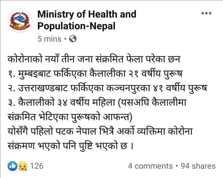 काठमाडौं । विश्वभर महामारीको रुपमा फैलिएको कोरोना पहिलो पटक नेपालभित्र फैलिएको छ । यसअघि विदेशबाट आएका छ जनामा कोरोना देखिएपनि उनीहरुबाट नेपालभित्र कोरोनाको संक्रमण भएको रिपोर्ट आएको थिएन । स्वास्थ्य तथा जनसंख्या मन्त्रालयले थप तीन जना नेपालीलाई कोरोना रोगले छोएको पुष्टि गरेको छ ।