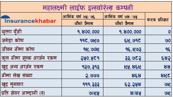 महालक्ष्मी लाईफले गत आर्थिक वर्षको चौथो त्रैमासिक विवरण सार्वजनिक गर्दै सुरुवाती कारोबार उत्साहप्रद रहेको देखिएको हो । गतवर्ष मात्रै कूल एक अर्ब ४० करोड रुपैयाँ लगानी गरी सुरु गरिएको महालक्ष्मी लाईफले सुरुवातमै अब्बल बीमा कम्पनीको झै वित्तिय विवरण सार्वजनिक गर्न सफल भएको हो ।