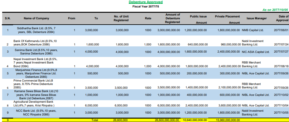 त्यसैगरी कृषि विकास बैंक लिमिटेडले मंसिर २९ गते बिहीबार सेबोनमा निवेदन पेश गरेकोमा बोर्डले बैंकलाई माघ ५ गते, सोमबार ऋणपत्र निष्काशन गर्न अनुमति दिएको हो । बैंकले ७ वर्ष अवधिको लागि ६ अर्ब रुपैयाँ बराबरको ‘७ वर्ष, ४ प्रतिशत कृषि ऋणपत्र’ नाम गरेको ६० लाख कित्ता ऋणपत्र निष्कासन गर्न निवेदन पेश गरेको छ ।