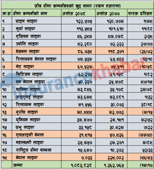 यस समिक्षा अवधिमा रिलायबल नेपाल लाइफले ७ करोड ४५ लाख रुपैयाँ, सिटिजन लाइफले ६ करोड २२ लाख,सन नेपाल लाइफले ५ करोड २ लाख,सानिमा लाइफले ४ करोड ३८ लाख,आइएमई लाइफले ४ करोड ३६ लाख,रिलायन्स लाइफले ४ करोड १५ लाख रुपैयाँ,यूनियन लाइफले ३ करोड ४४ लाख, प्रभु लाइफले ३ करोड ३१ लाख, महालक्ष्मी लाइफले २ करोड ५४ लाख र राष्ट्रिय बीमा संस्थानले १ करोड ५६ लाख रुपैयाँ नाफा आर्जन गरेका छन् ।