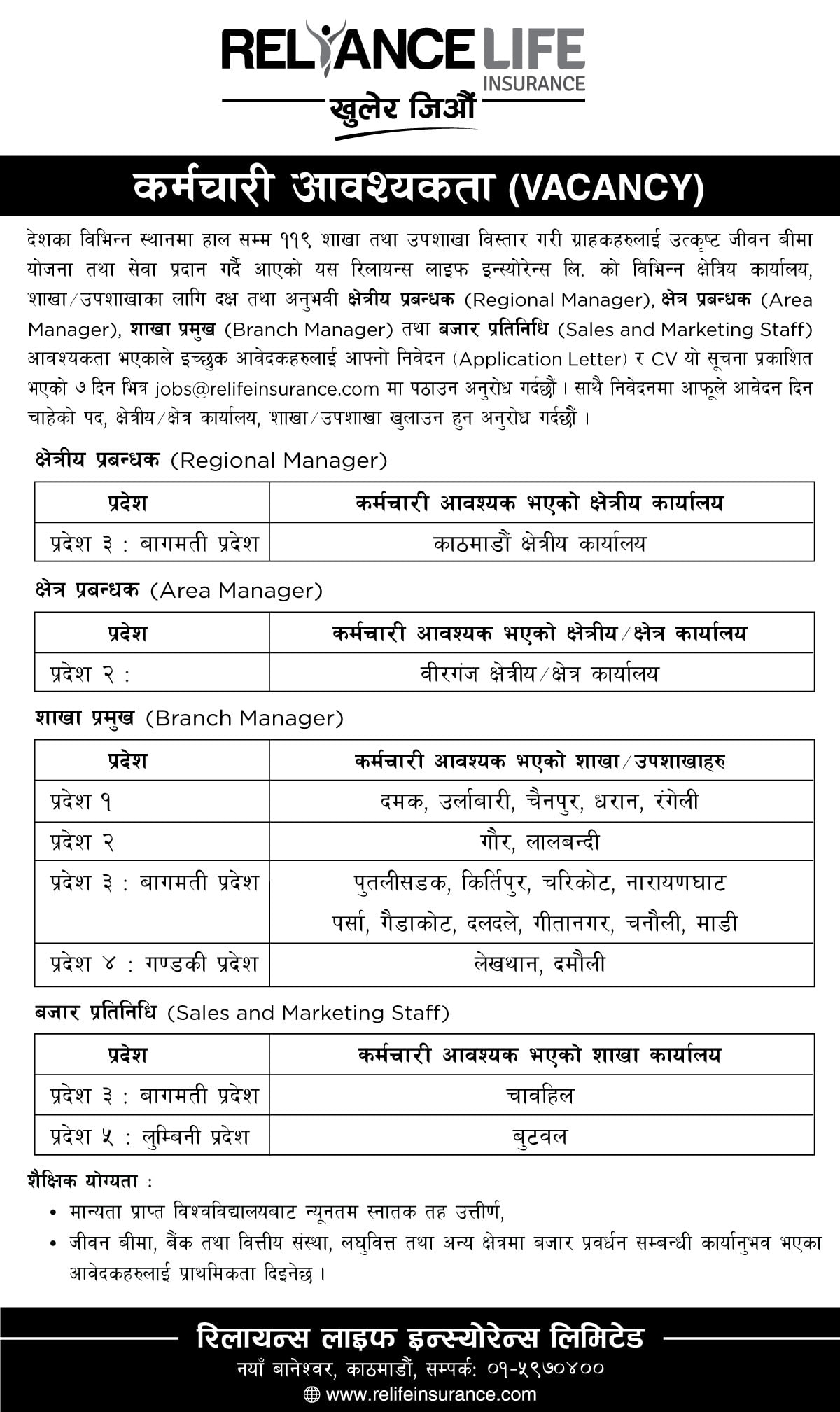काठमाडौं । रिलायन्स लाइफ इन्स्योरेन्स कम्पनीले विभिन्न पदका लागि कर्मचारीको माग गरेको छ । कम्पनीले प्रदेश नं. ३ का लागि क्षेत्रिय प्रबन्धमा केही, क्षेत्र प्रबन्धकका लागि प्रदेश नं. दुईमा, शाखा प्रमुखका लागि प्रदेश नं. १,२, वागमति र गण्डकी प्रदेशमा केही, बजार प्रतिनिधिका लागि वागमति र लुम्बिनी प्रदेशका लागि कर्मचारीको माग गरेको जनाएको छ ।