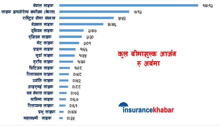 त्यस्तै, नेशनल लाइफ इन्स्योरेन्सले ४ अर्ब ४६ करोड रुपैयाँ, यूनियन लाइफले २ अर्ब ४७ करोड रुपैयाँ, एशियन लाइफले २ अर्ब ३० करोड रुपैयाँ, मेट लाइफले २ अर्ब १ करोड रुपैयाँ, प्राइम लाइफले १ अर्ब ६६ करोड रुपैयाँ, सूर्या लाइफले १ अर्ब ५५ करोड रुपैयाँ, गुराँस लाइफले १ अर्ब ४० करोड रुपैयाँ र सिटिजन लाइफले १ अर्ब ८ करोड रुपैयाँ बीमाशुल्क आर्जन गर्न सफल भएका छन् ।