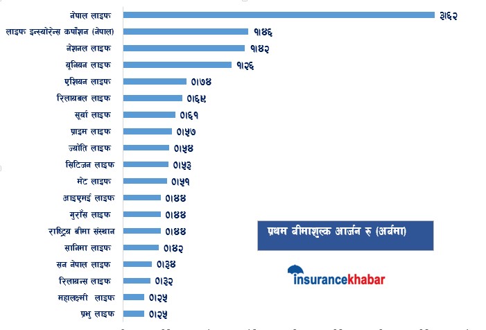 मंसिर मसान्तसम्ममा नेपाल लाइफ इन्स्योरेन्स कम्पनीले तीन अर्ब ६२ करोड रुपैयाँ प्रथम बीमाशुल्क आर्जन गर्न सफल भएको छ । दोस्रोमा लाइफ इन्स्योरेन्स कर्पोशन (नेपाल) रहेको छ । कम्पनीले यस अवधिसम्ममा एक अर्ब ४६ करोड रुपैयाँ प्रथम बीमाशुल्क आर्जन गर्न सफल भएको छ ।