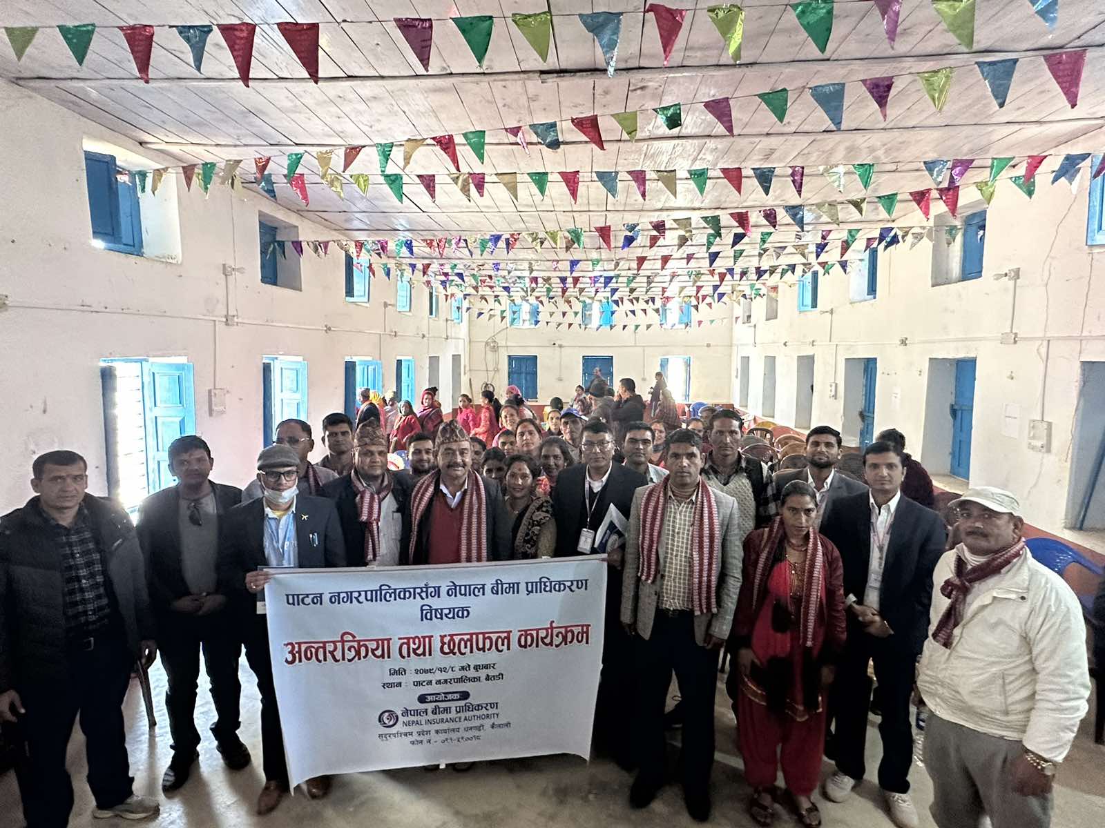 काठमााडैं । नेपाल बीमा प्राधिकरण सुदुरपश्चिम प्रदेश कार्यालय धनगढीले बीमा सम्बन्धी चेतनामुलक कार्यक्रमहरुका आयोजना गर्दै आइरहेको छ । यस कार्यालयले देशको सुगम ठाउँदेखि दुर्गम ठाउँसम्म गएर बीमा चेतनामुलक कायृक्रमको आयोजना गर्दै आइरहेको छ । यसै सन्दर्भमा प्राधिकरणको सुदुरपश्चिम प्रदेश कार्यालय धनगढीले बैतडी जिल्लाको पाटन नगरपालिकाको कार्यालयमा बीमा सम्बन्धी जनचेतनामुलक कार्यक्रम सम्पन्न गरेको हो ।