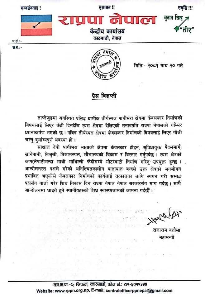 पार्टीले एउटा विज्ञप्ति जारी गर्दै ध्यानाकर्षण भएको जनाएको हो। विज्ञप्तिमा प्रसिद्ध धार्मिकस्थलमा केबलकार निर्माणको विषयलाई लिएर केही दिन उत्पन्न तनाव र गोली चल्नु दुर्भाग्यपूर्ण भएको जनाइएको छ।