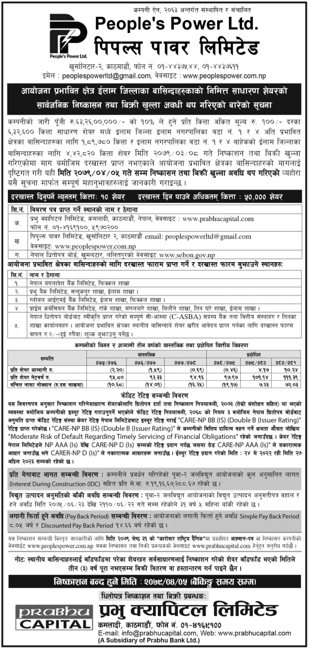 काठमाडौं । पिपुल्स पावर लिमिटेडले आयोजना प्रभावित क्षेत्रका बासिन्दाहरुका लागि निष्काशन गरेको गरेको साधारण शेयर आइपीओमा आवेदन दिने समय थप भएको छ । अब उक्त आइीओमा साउन ५ गतेसम्म आवेदन दिन सकिनेछ ।