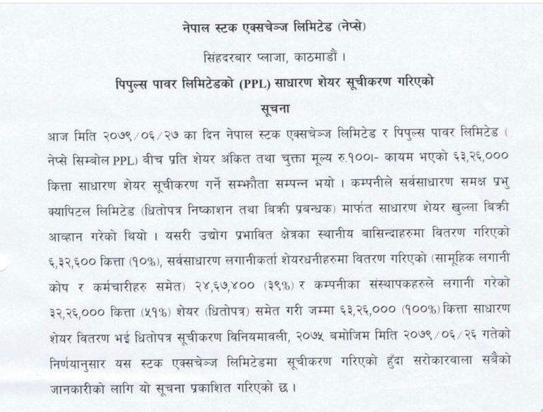पिपुल्स पावर लिमिटेडले साउन ३१ गतेदेखि भदौ ५ गतेसम्म सर्वसाधारणलाई आईपिओ बिक्रि खुला गरेको थियो । पिपुल्स पावरले इलाम जिल्लाको इलाम नगरपालिकामा अवस्थित पुवाखोलामा ४।९६ मेगावाटको आयोजना निर्माण गरिरहेको छ ।
