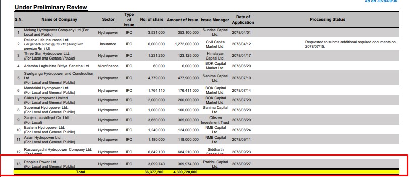 काठमाडौं । पिपुल्स पावर लिमिटेडले आईपीओ निष्काशन गर्नका लागि नियामक निकाय नेपाल धितोपत्र बोर्डमा निवेदन पेश गरेको छ । कम्पनीले ३० करोड ९९ लाख ७४ हजार रुपैयाँ बरारको ३० लाख ९९ हजार ७४० कित्ता आईपीओ निष्काशनका लागि नियामक निकाय नेपाल धितोपत्र बोर्डमा निवेदन दिएको हो ।