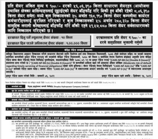 काठमाडौं । पिपुल्स हाइड्रोपावर कम्पनी लिमिटेडले कार्तिक २५ गतेदेखि सर्वसाधारणमा प्राथमिक शेयर आइपीओ निष्काशन गर्ने भएको छ । कम्पनीले आयोजना प्रभावित क्षेत्रका बासिन्दामा विक्री नभएको ८ लाख ६ हजार ३९० कित्ता शेयर सहित प्रतिकित्ता १०० रुपैयाँ अंकित कुल ५६ लाख ६ हजार ३९० कित्ता शेयर सर्वसाधारणमा निष्काशन गर्न लागेको जनाएको छ ।