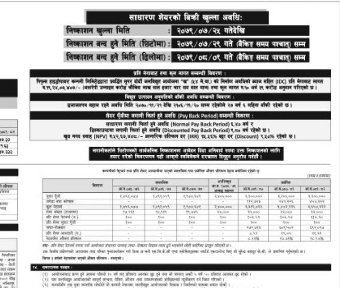 कम्पनीको शेयर निष्काशन तथा विक्री प्रबन्धक सानिमा क्यापिटल लिमिटेड रहेको छ । लगानीकर्ताले न्यूनतम १० कित्ता शेयर खरिदका लागि आवेदन दिनु पर्नेछ भने अधिकतममा १ लाख कित्ता शेयरका लागि आवेदन दिन सक्नेछन् ।