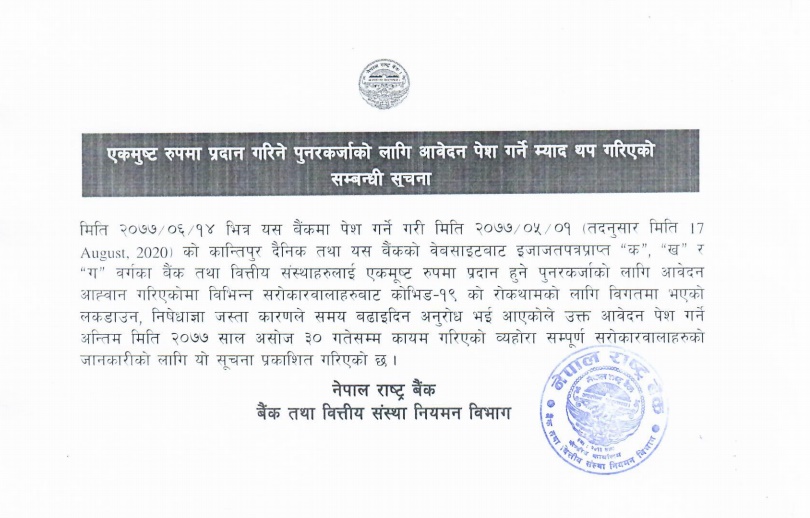 विभिन्न सरोकारवालाहरूमा कोरोना भाइरसक रोकथामका लागि विगतमा भएको लकडाउन र निषेधाज्ञा जस्ता कारणले समय बढाइदिन अनुरोध गरेपछि म्याद थप गरिएको राष्ट्र बैंकलेबताएको छ ।