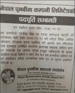 कम्पनीले बुधबार पुःन पदपुर्तिका लागि सुचना प्रकाशित गरेको छ । उक्त पदका लागि इच्छुक, योग्यता पुगेका व्यक्तिले ७ दिन भित्र आवेदन दिन सक्ने कम्पनीले उल्लेख गरेको छ ।