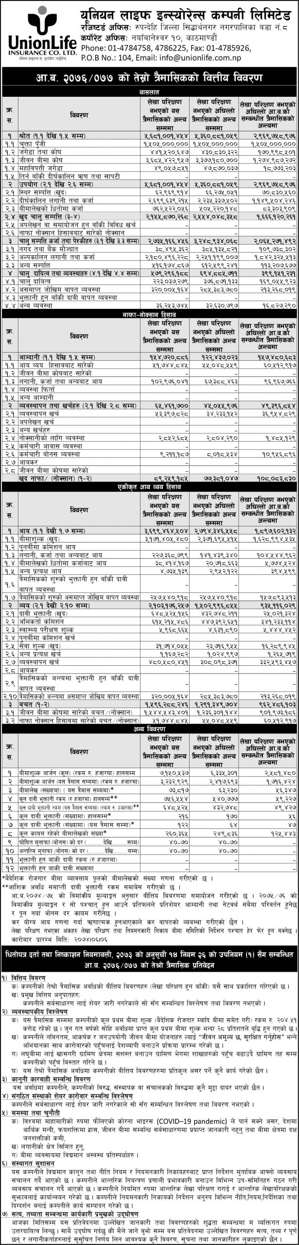 युनियन लाईफ इन्स्योरेन्सको व्यवसायमा छलाङ्ग मार्ने क्रम जारी छ। चालु आर्थिक वर्षको तेश्रो त्रैमाससम्म कम्पनीले ३ अर्ब २३ करोड कुल बीमा शुल्क आर्जन गरेको छ। गत आर्थिक वर्षको तेश्रो त्रैमासमा कम्पनीले १ अर्ब ७१ करोड कुल बीमा शुल्क आर्जन गरेको थियो । कुल बीमा शुल्क आर्जन रकम ८८ प्रतिशतले वृद्धि भएको छ। त्यस्तै खुद बीमा शुल्क आर्जन ३ अर्ब १७ करोड पुगेको छ। गत आर्थिक वर्षको तेश्रो त्रैमाससम्म सो रकम १ अर्ब ६२ करोड रहेको थियो।