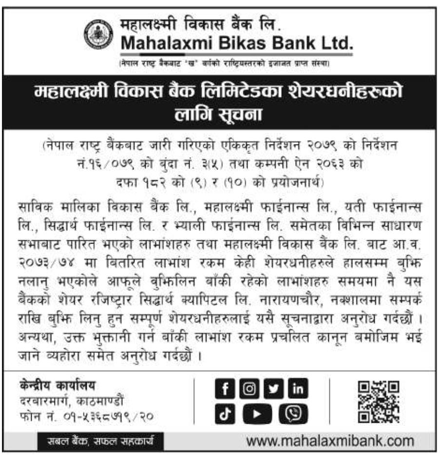 लाभांश रकम लिन बाँकी शेयरधनीहरुले बैंकको शेयर रजिष्ट्रार सिद्धार्थ क्यापिटल लिमिटेड नारायणचौर नक्सालमा सम्पर्क राखी लिन रसक्नेछन् । अन्यथा भुक्तानी गर्न बाँकी लाभांश रकम प्रचलित कानुन बमोजिम लगानीकर्ता समंरक्षण कोषमा जम्मा हुने समेत बैंकले जनाएको छ ।