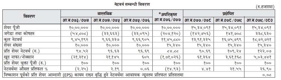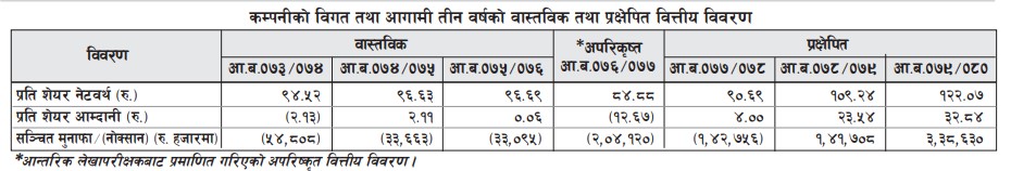 प्रक्षेपित तथ्यांक अनुसार आर्थिक वर्ष ७७/७८ मा प्रति शेयर आम्दानी ४ रुपैयाँ र किताबी मूल्य ९० रुपैयाँ ६९ पैसा हुन्छ । आर्थिक वर्ष ७८/७९ मा भने प्रति शेयर आम्दानी २३ रुपैयाँ ५४ पैसा र किताबी मूल्य १०९ रुपैयाँ २४ पैसा र आर्थिक वर्ष ७९/८० मा भने प्रति शेयर आम्दानी ३२ रुपैयाँ ८४ पैसा र किताबी मूल्य १२२ रुपैयाँ ०७ पैसा हुने कम्पनीले प्रक्षेपण गरेको छ।