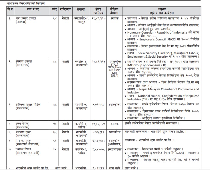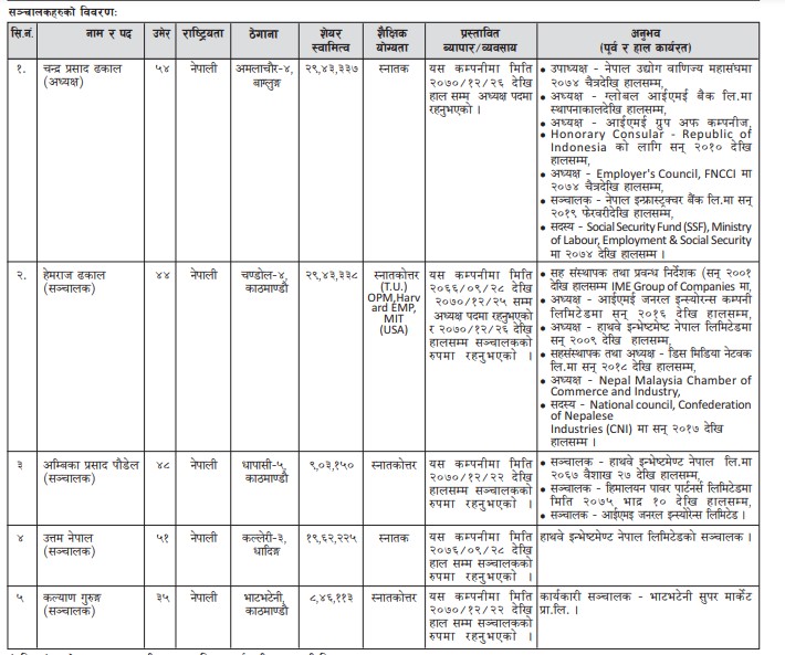 कम्पनीमा चन्द्र प्रसाद ढकालको नाममा २९ लाख ४३ हजार कित्ता शेयर स्वामित्तव रहेकोमा हेमराज ढकालको नाममा पनि २९ लाख ४३ हजार कित्ता शेयर स्वामित्तव रहेको छ।