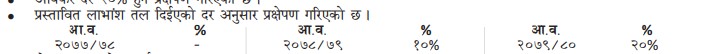 कम्पनीले ७८/७९ मा १० प्रतिशत लाभांश प्रक्षेपण गरेको छ भने आर्थिक वर्ष ७९/८० मा २० प्रतिशत लाभांश प्रक्षेपण गरेको छ।