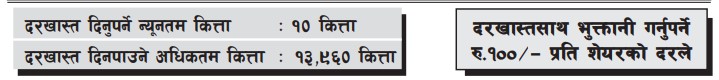 न्युनतम १० कित्ता देखि अधिकतम १३,९६० कित्ता सम्म आवेदन दिन सकिन्छ ।