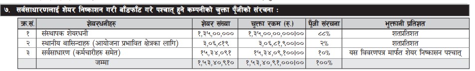 आईपीओ पश्चात कम्पनीको चुक्ता पुँजी १ अर्ब ५३ करोड हुने छ। आईपीओ प्रक्रिया पश्चात कम्पनीमा सस्थापक शेयरको हिस्सा ८८ प्रतिशत हुने छ आयोजना प्रभावित स्थानीय बासिन्दाहरुको शेयर हिस्सा २ प्रतिशत हुने छ भने सर्वाशाधारणको हिस्सा १० प्रतिशत हुने छ ।