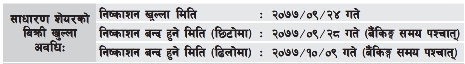 चन्द्रागिरि हिल्स लिमिटेडको आईपीओ पुष २४ गते देखि पुष २८ गते सम्म खुल्नेछ । पुष २८ गते बैंकिङ्ग समय पश्चात आवेदन दिन सकिने छैन । यदि, पुष २८ गते सम्म पनि सम्पूर्ण शेयर कित्तामा आवेदन नपरेको अवस्थामा माघ ९ गते सम्म समय थपिने छ । विगत देखिको तथ्याङ्क अनुसार समय थपिने सम्भावना देखिदैन।