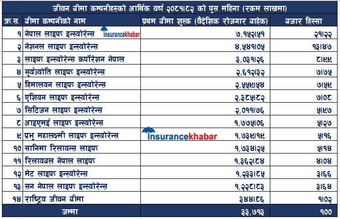 सिटिजन लाइफले २० करोड ११ लाख रुपैयाँ प्रथम बीमाशुल्क संकलन गरेको छ । आइएमई लाइफले १७ करोड ७५ लाख रुपैयाँ प्रथम बीमाशुल्क संकलन गरेको छ । प्रभु महालक्ष्मी लाइफले १७ करोड ३९ लाख रुपैयाँ प्रथम बीमाशुल्क संकलन गरेको छ । सानिमा रिलायन्स लाइफले १७ करोड ३४ लाख रुपैयाँ प्रथम बीमाशुल्क संकलन गरेको छ ।