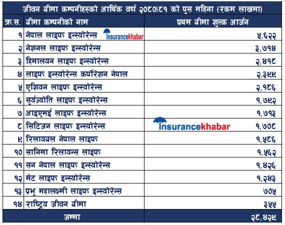 पुसमा सबैभन्दा धेरै नेपाल लाइफ इन्स्योरेन्स कम्पनीले प्रथम बीमा शुलक आर्जन गरेको छ । कम्पनीले पुसमा ५६ करोड २२ लाख रुपैयाँ प्रथम बीमा शुल्क संकलन गरेको छ । दोस्रोमा नेशनल लाइफ इन्स्योरेन्स कम्पनीले रहेको छ । कम्पनीले यस अवधिमा ३७ करोड १४ लाख रुपैयाँ प्रथम बीमा शुल्क संकलन गरेको छ ।