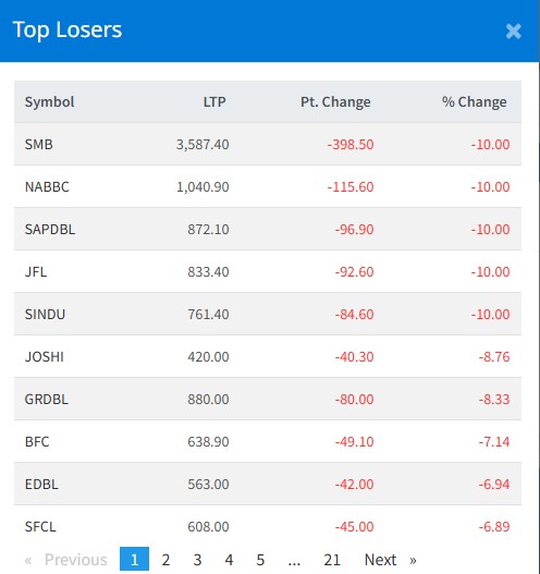 आज सबैभन्दा धेरै सपोर्ट माइक्रोफाइनान्स, नारायणी डेभलपमेन्ट बैंक, सप्तकोशी, जानकी फाइनान्स, सिन्धु विकास बैंकका लगानीकर्ताले गुमाएका छन् । आज यी कम्पनीका लगानीकर्ताले १० प्रतिशतका दरले गुमाएका हुन् ।