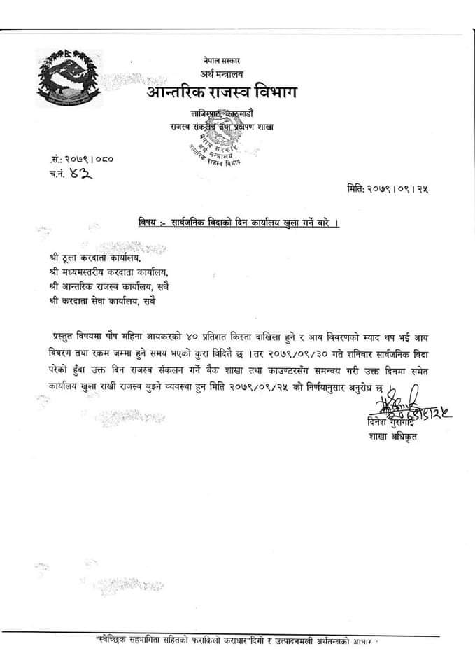 पुस २७ गते सार्वजनिक विदा दिने सरकारको निर्णय