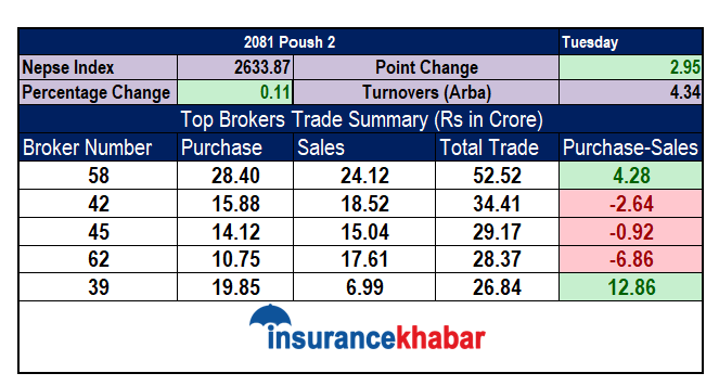 बजारमा ४ अर्ब ३४ करोड रुपैयाँबराबरको कारोबार भएको दिन ब्रोकर नम्बर ५८ बाट सर्वाधिक रकमको कारोबार भएको छ। ब्रोकर नम्बर ५८ बाट ५२ करोड ५२ लाख रुपैयाँको कारोबार भएको छ। जसमा २८ करोड ४० लाख रुपैयाँको शेयर खरिद छ भने २४ करोड १२ लाख रुपैयाँको बिक्री छ।