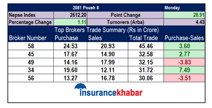 ४ अर्ब ४३ करोड कारोबार भएको दिन ब्रोकर नम्बर ५८ बाट सर्वाधिक रकमको कारोबार भएको छ । ब्रोकर नम्बर ५८ बाट ४५ करोड ४६ लाखको कारोबार भएको छ जसमा २४ करोड ५३ लाखको खरिद र २० करोड ९३ लाख रुपैयाँको बिक्री भएको छ।