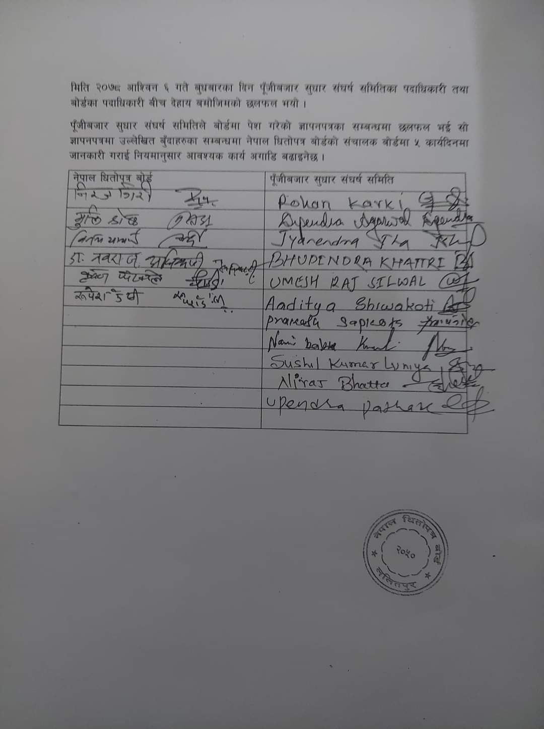 काठमाडौं । पूँजी बजार संघर्ष समितिका पदाधिकारी तथा नेपाल धितोपत्र बोर्डका पदाधिकारीहरु बीचमा सहितिका माग संवोधन गर्ने विषयमा सहमति सहमति भएको छ । आज साँझ उक्त सहमति भएको हो । पूँजी बजार सुधार संघर्ष समितले बोर्डमा पेश गरेको ज्ञापनपत्रका सम्बन्धमा छलफल भई सो ज्ञापनपत्रमा उल्लेखित बुँदाहरुका सम्बन्धमा नेपाल धितोपत्र बोर्डको संचालक बोर्डमा ५ कार्यदिनमा जानकारी गराई नियमानुसार आवश्यक कार्य आगाडी बढाउने सहमति भएको हो ।