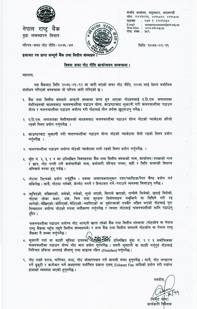 राष्ट्र बैंकका मुद्रा व्यवस्थापन विभागका कार्यकारी निर्देश्क विश्रुत थापाले हस्ताक्षर गरी आज जारी निर्देशनमा नोटलाई एटिएम मेशिन तथा काउन्टरबाट सेवाग्राहीलाई दिनु अघि डिसइन्फेक्सन गर्नुपर्ने व्यवस्था गरिएको छ । त्यस्तै अब हरेक बैंकले नोटलाई चलनचल्तीका लागि योग्य भए हरियो र चलनचल्तीका लागि अयोग्य भए रातो क्लीपले बाँधेर राख्न समेत निर्देशन दिएको छ ।