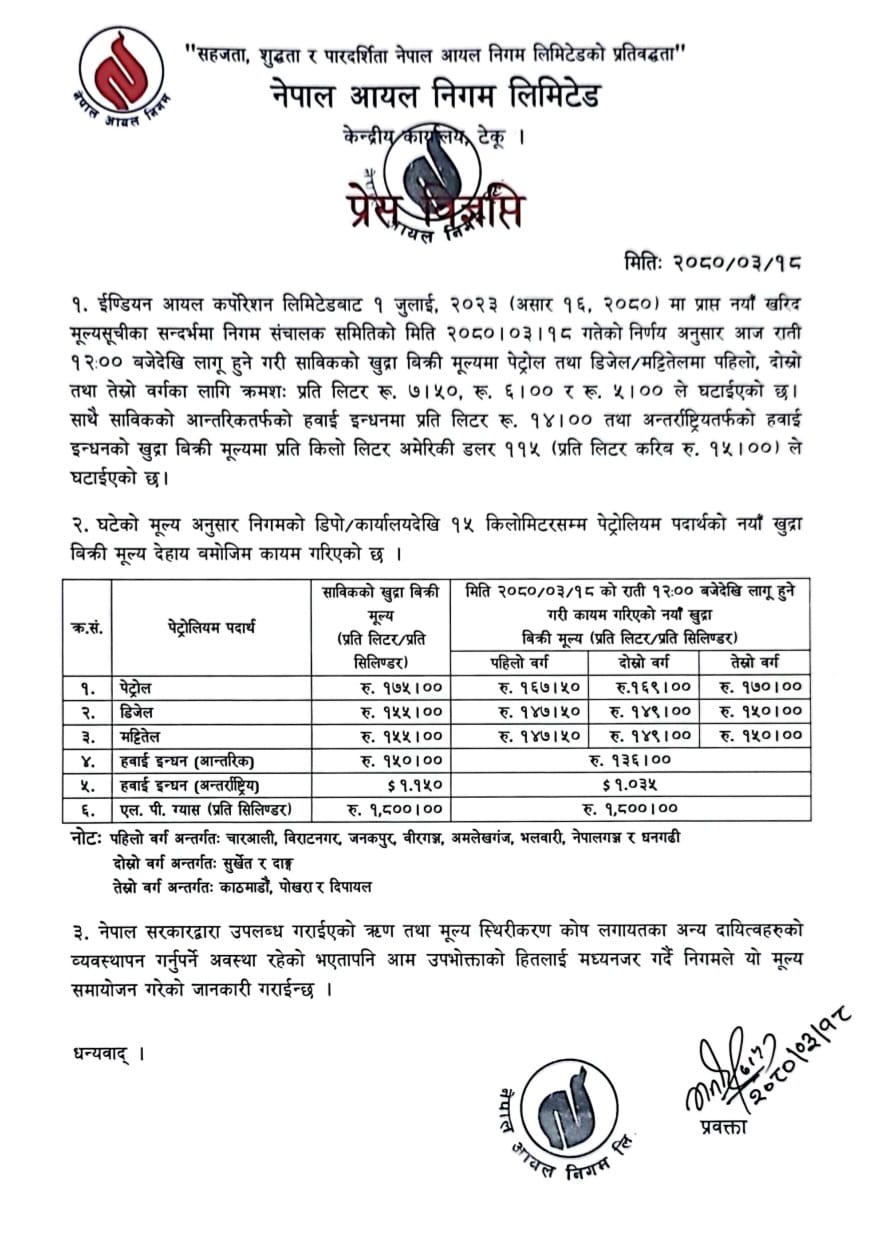 अब काठमाडौं‚ पोखरा र दीपालयमा पेट्रोलको मूल्य प्रतिलिटर १७० रुपैयाँ पर्नेछ भने डिजेल र मट्टितेलको मूल्य प्रतिलिटर १५०/१५० रुपैयाँ पर्नेछ । त्यस्तै तराईमा पेट्रोलको मूल्य प्रतिलिटर १६७.५ रुपैयाँ पर्नेछ भने डिजेल र मट्टितेलको मूल्य प्रतिलिटर १४७.५/१४७.५ रुपैयाँ पर्नेछ ।