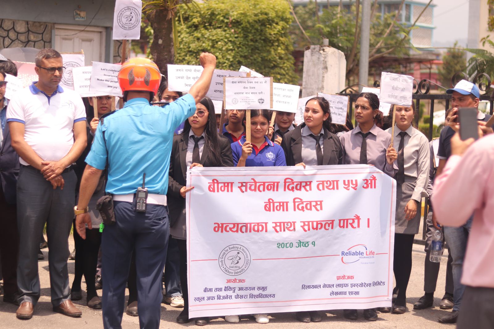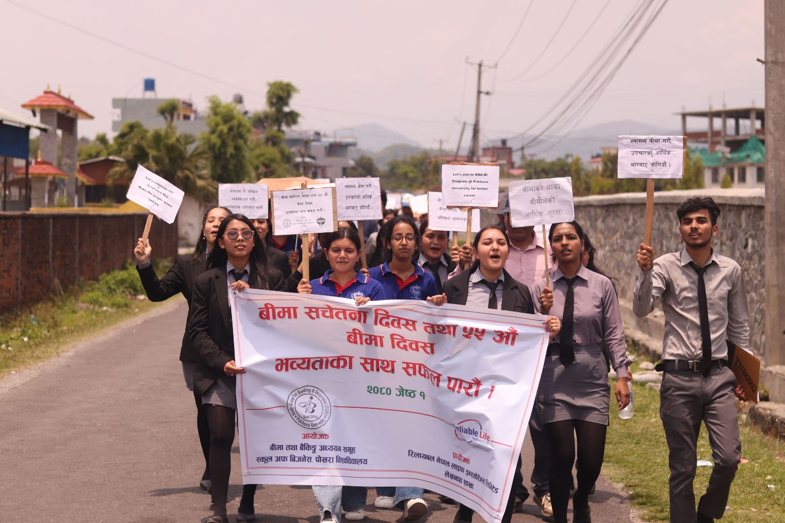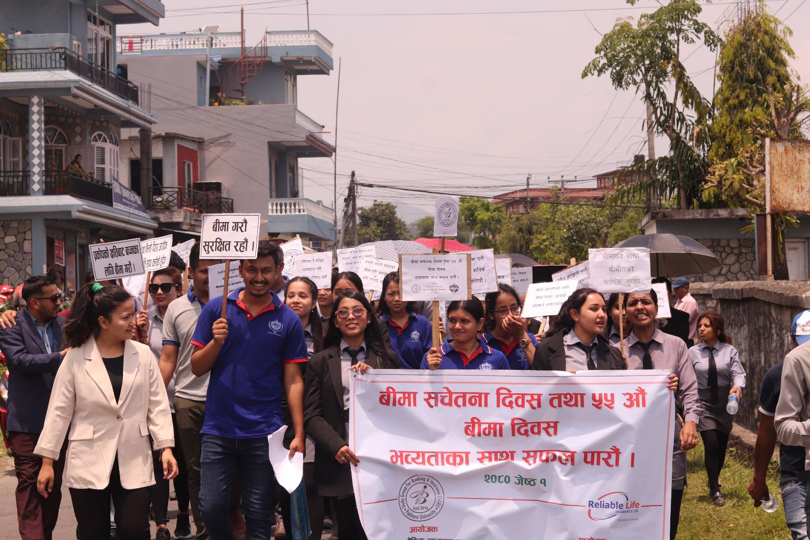 र्यालीको नेतृत्व स्कूल अफ बिजनेसका निर्देशक डा. श्रृजन ज्ञवालीले गरेकी थिइन् । र्यालीमा प्राध्यापक, बिद्यार्थी, कर्मचारीहरुको पनि सहभागीता थियो । र्यालीको बिसर्जन पोखरा विश्वविद्यालय केन्द्रिय कार्यालयमा पुगेर भएको थियो भने बिसर्जन सभालाई सम्बोधन गर्दै सह प्राध्यापक डा. रविन्द्र घिमिरेले बीमाको महत्व र अपरिहार्यताको बारेमा प्रकाश पारेका थिए ।