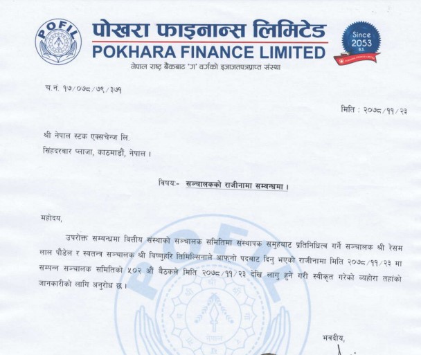 काठमाडौं । पोखरा फाइनान्स लिमिटेडका दुई जना सञ्चालकले पदबाट राजीनामा दिएका छन् । कम्पनीको संस्थापक समूहबाट प्रतिनिधित्व गरेका रेसम लाल पौडेल र स्वतन्त्र सञ्चालक बिष्णुहरि तिमिल्सिनाले पदबाट राजीनामा दिएका हुन् ।