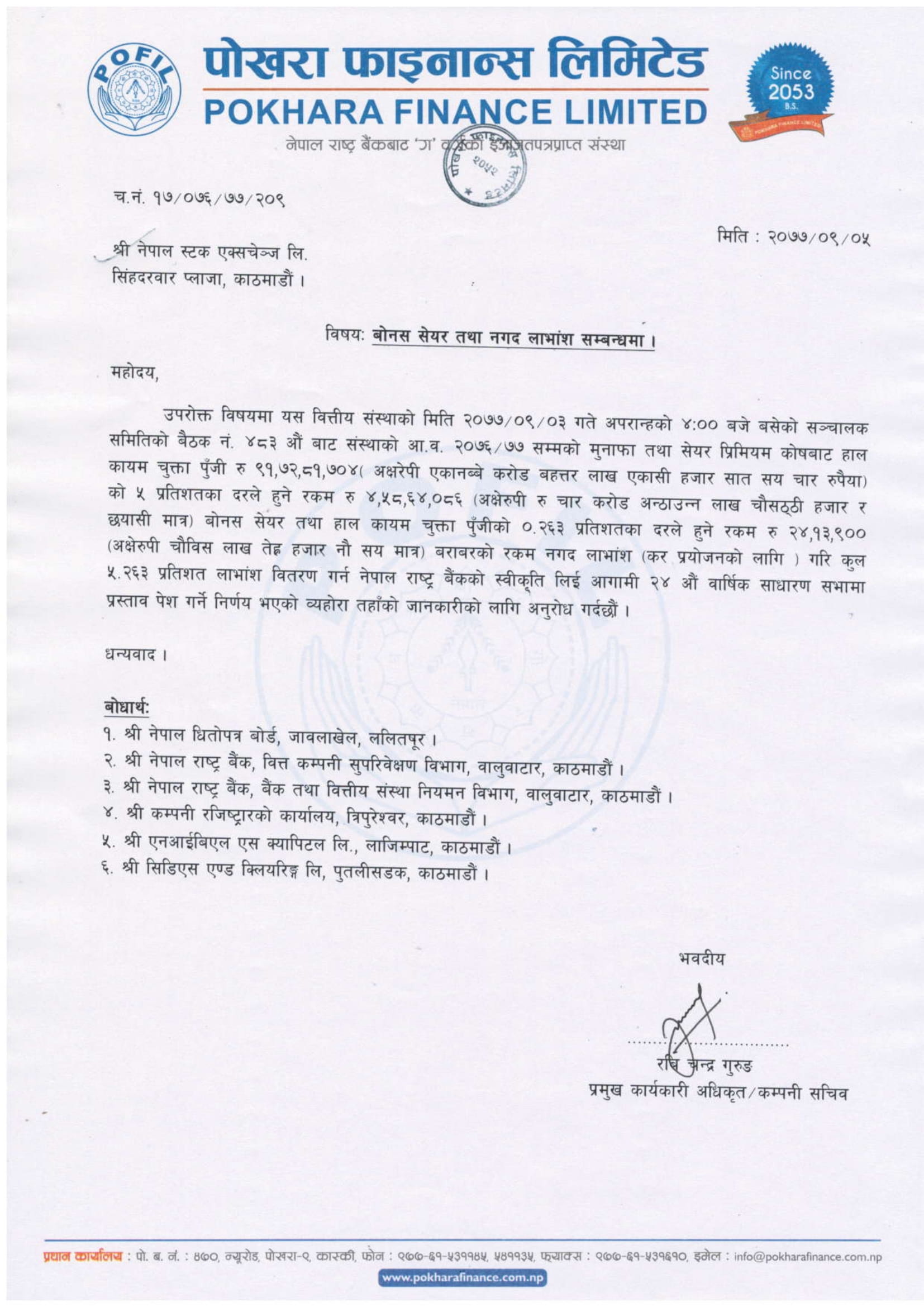 उक्त प्रस्तावित लाभांश नेपाल राष्ट्र बैंक र फाइनान्स कम्पनीको आगामी वार्षिक साधारण सभाले पारित गरेपछि वितरण गरिनेछ ।