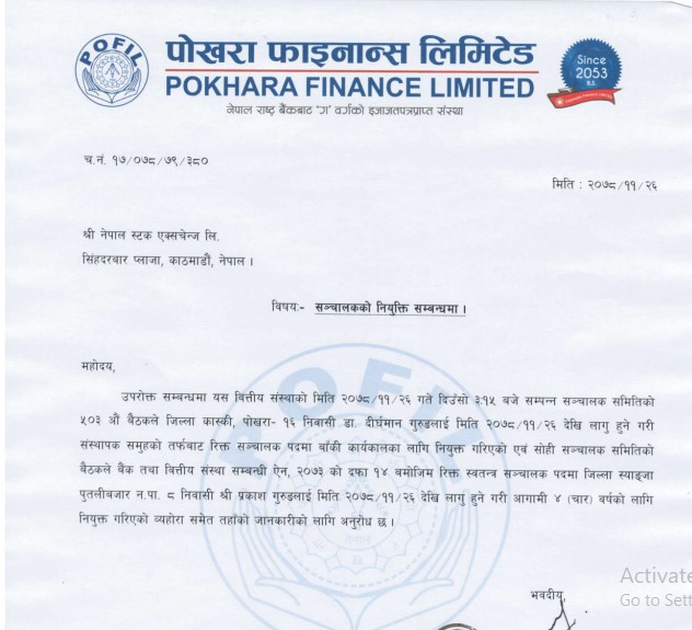 काठमाडौं । पोखरा फाइनान्स लिमिटेडमा दुई जना सञ्चालक नियुक्त भएका छन् । कम्पनीको फागुन २६ गते सम्पन्न सञ्चालक समितिको बैठकले संस्थापक समूहको रिक्त रहेको सञ्चालक पदमा डा. दीर्घमान गुरूङलाई फागुन २६ गतेदेखि लागू हुने गरी बाँकी कार्यकालको लागि नियुक्त गरेको हो ।