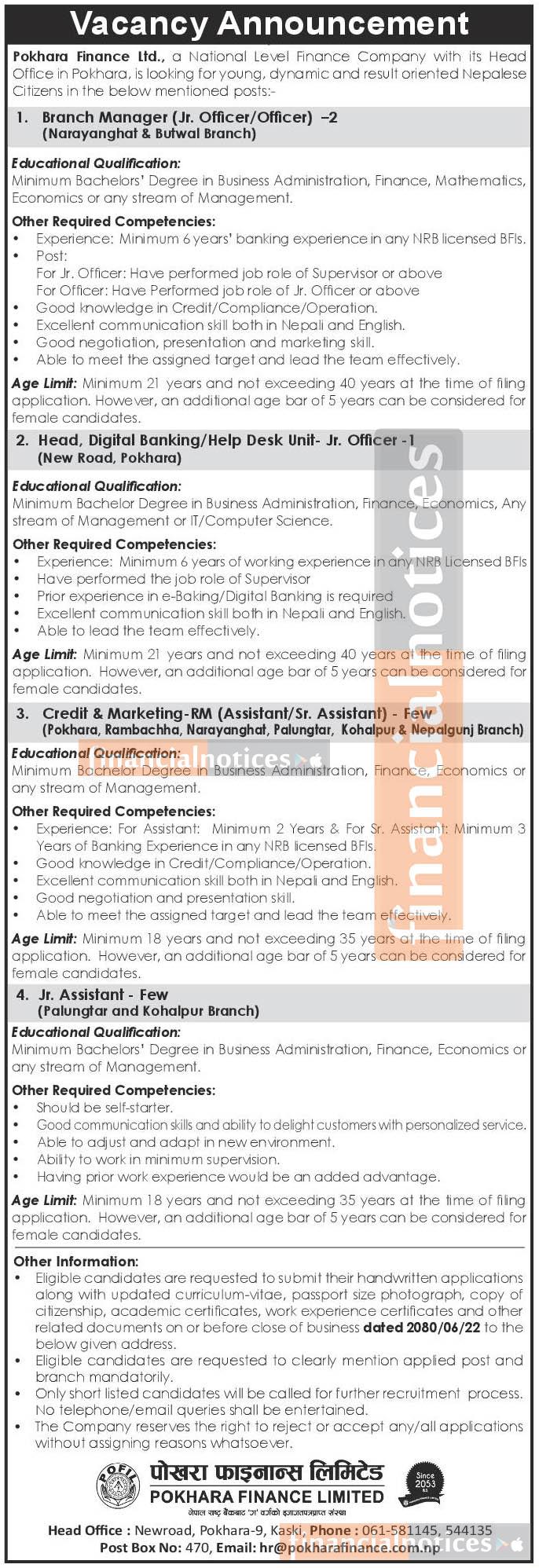 काठमाडौं । पोखरा फाइनान्स लिमिटेडले कर्मचारी माग गरेको छ । कम्पनीले ब्रान्च म्यानेजर (जुनियर अफिसर तथा अफिसर), हेड, डिजिटल बैंकिङ (हेल्प डेस्क यूनिट, जुनियर अफिसर), क्रेडिट र मार्केटिङ–आरएम (असिस्टेन्ट, सिनियर असिस्टेन्ट), जुनियर असिस्टेन्ट पदहरुका लागि केही संख्यामा कर्मचारी माग गरेको हो ।