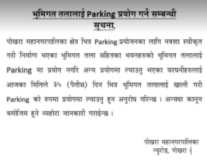 काठमाडौं । पोखरा महानगरपालिकाभित्र पार्किङ प्रयोजनका लागि नक्शा स्वीकृत गरि निर्माण गरिएको भूमिगत तला खाली गर्न घरधनीहरुलाई निर्देशन दिएको छ ।